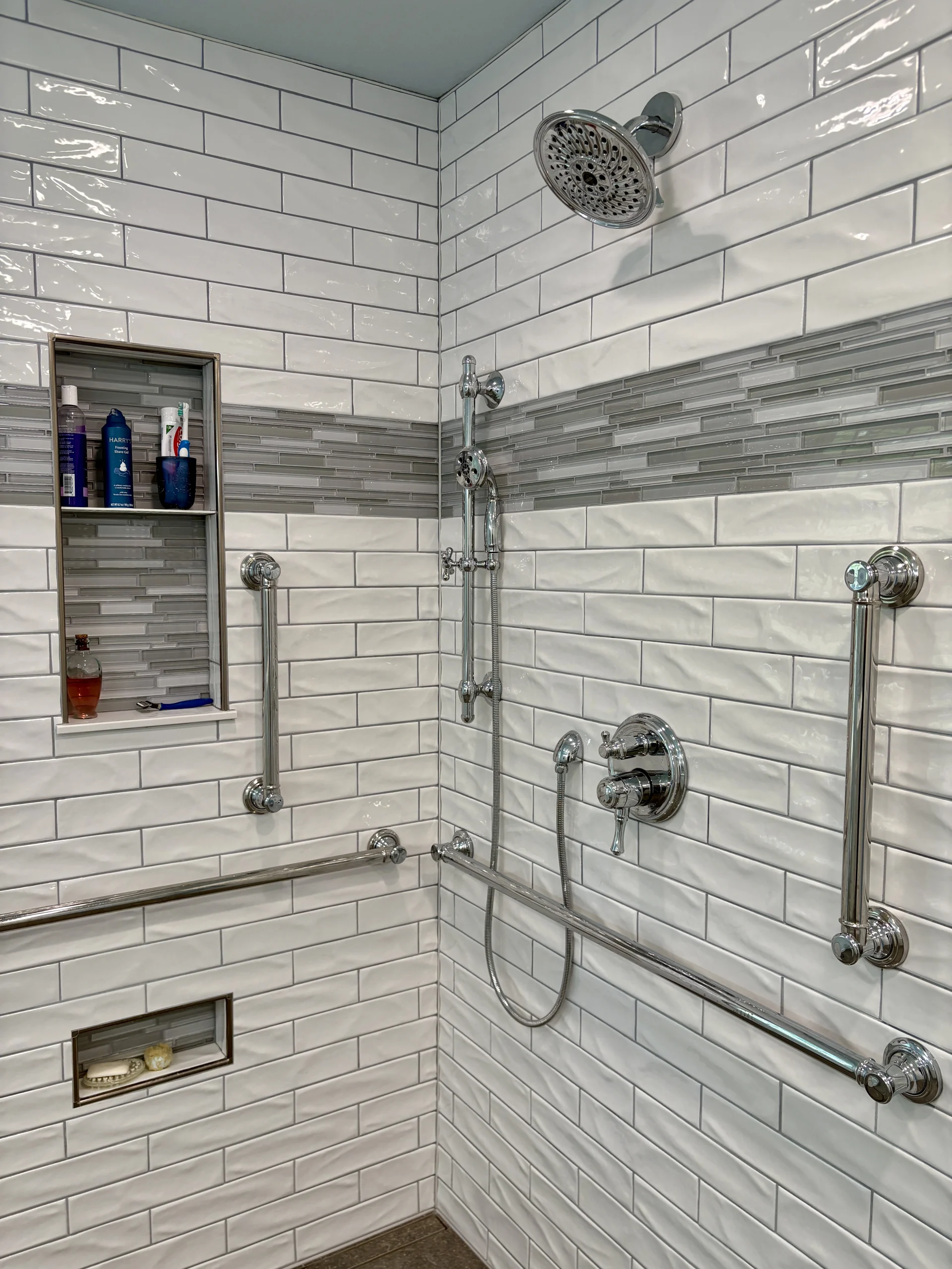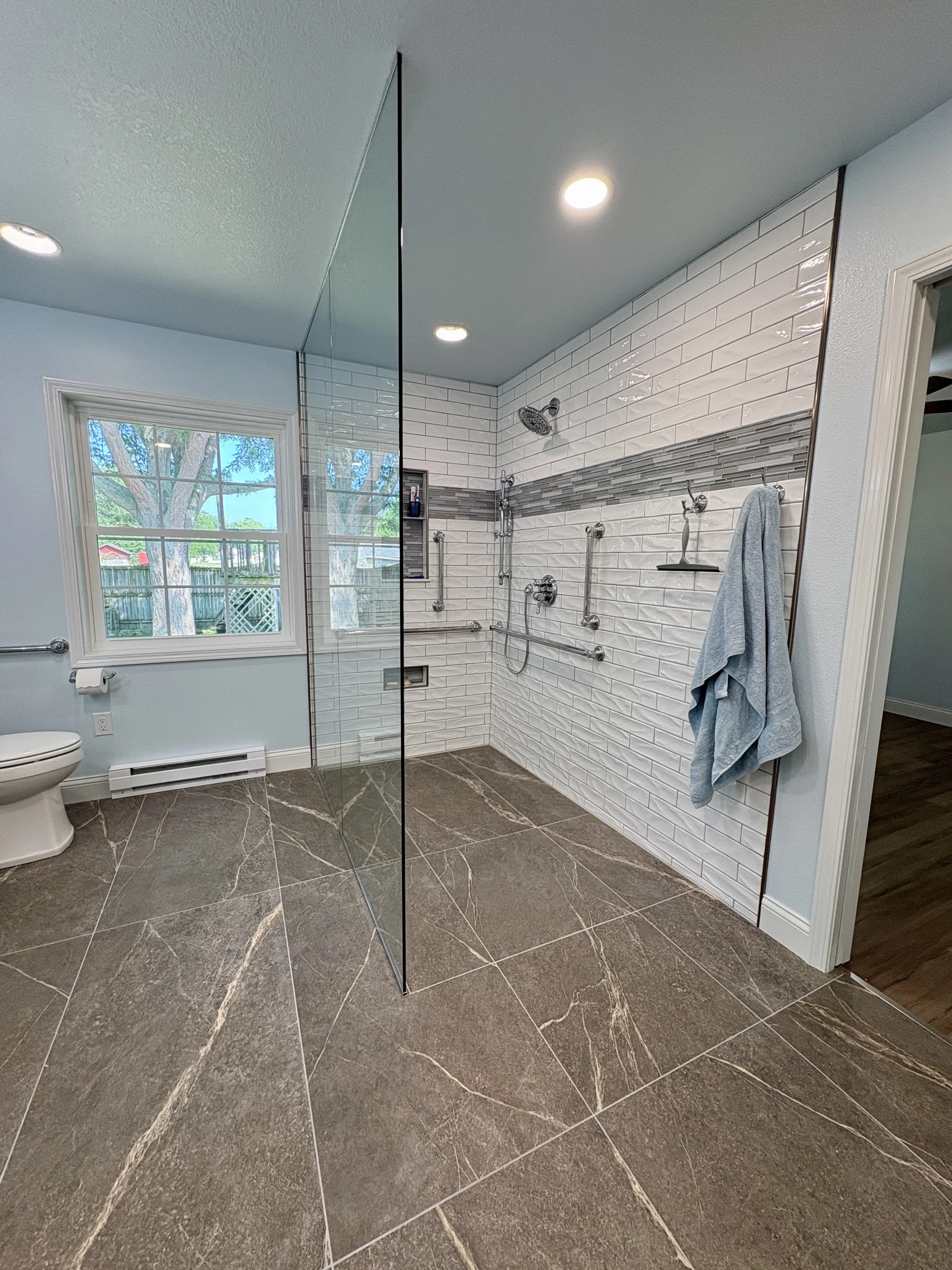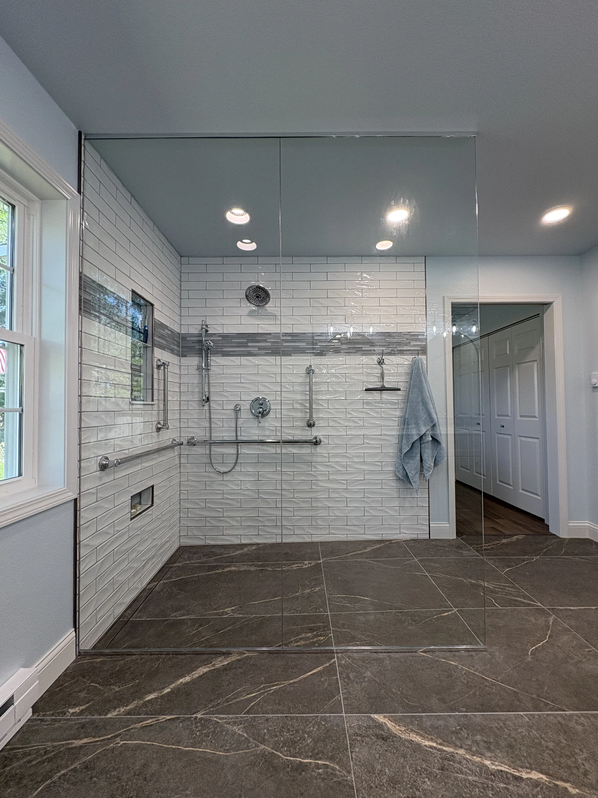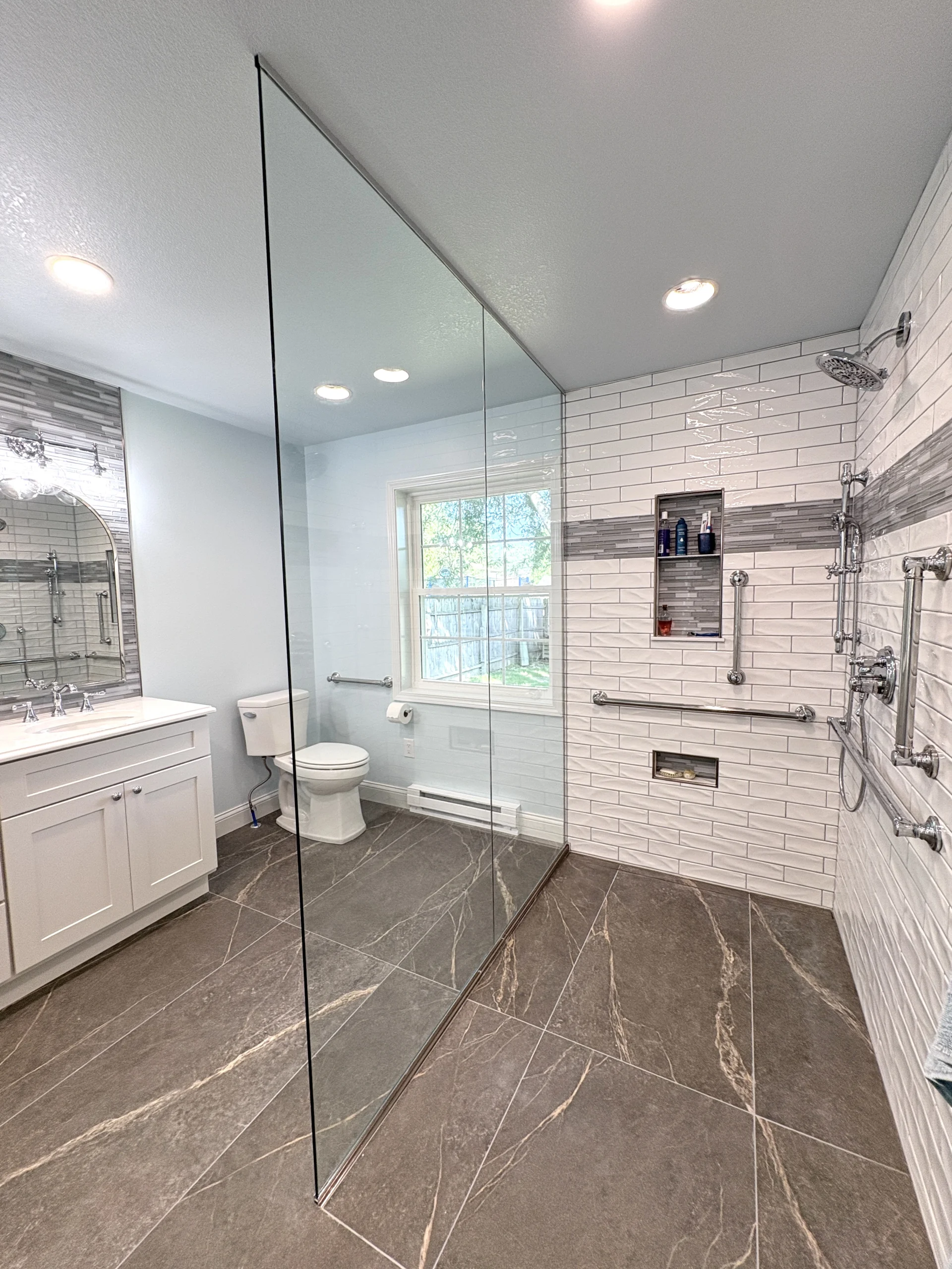 – Custom zero-entry shower featuring floor-to-ceiling glass, modern tilework, and multiple secure grab bars.