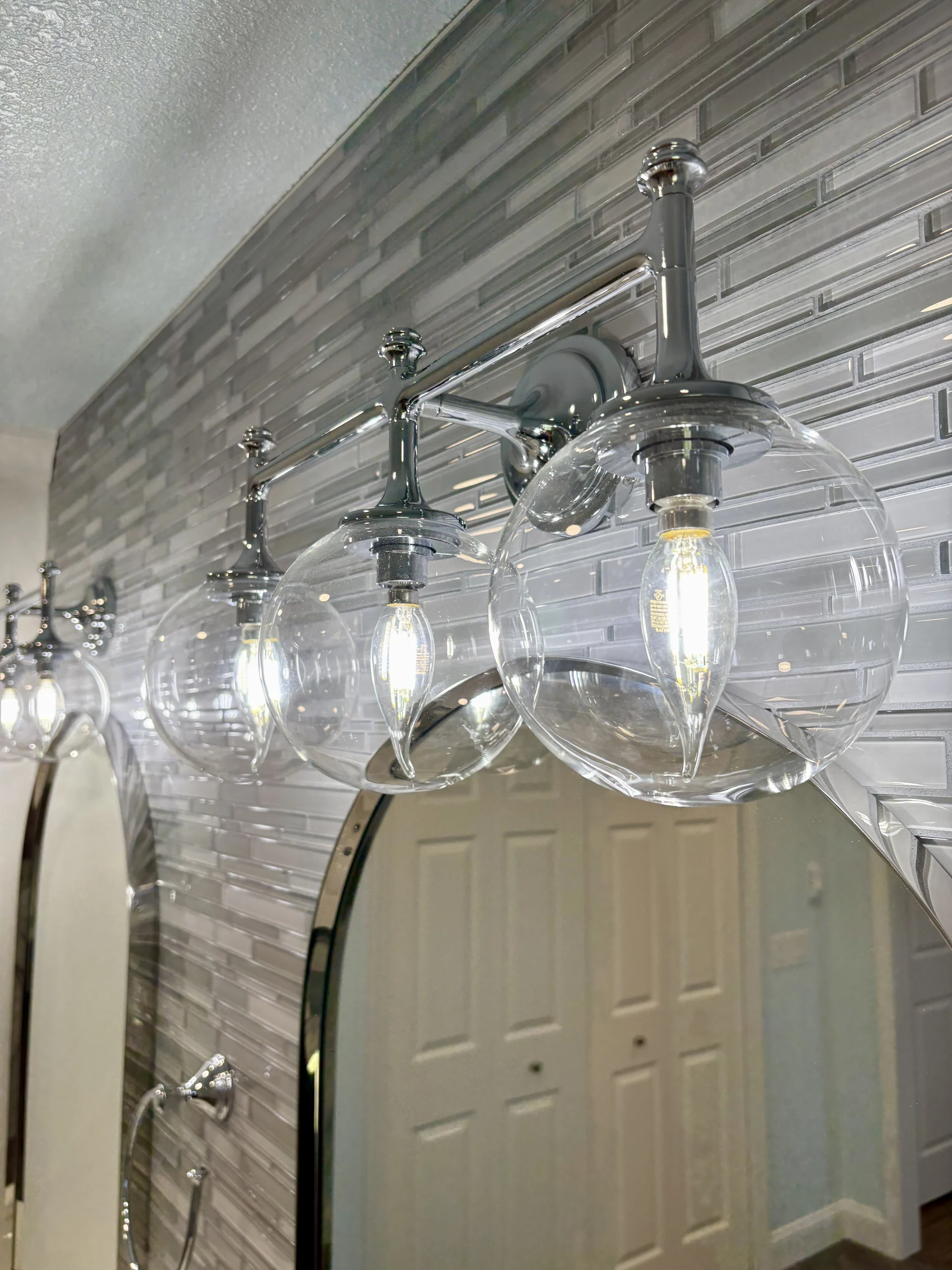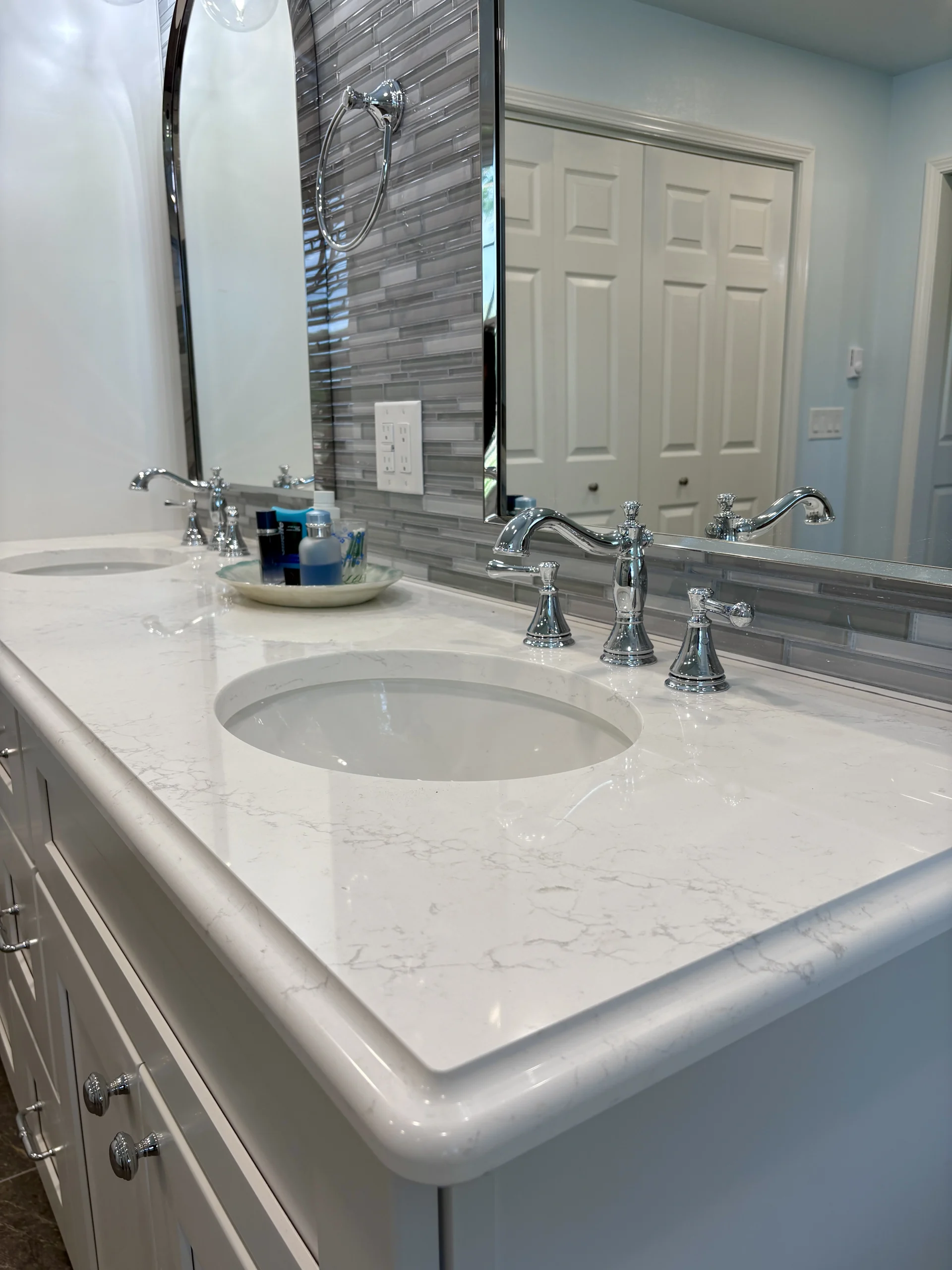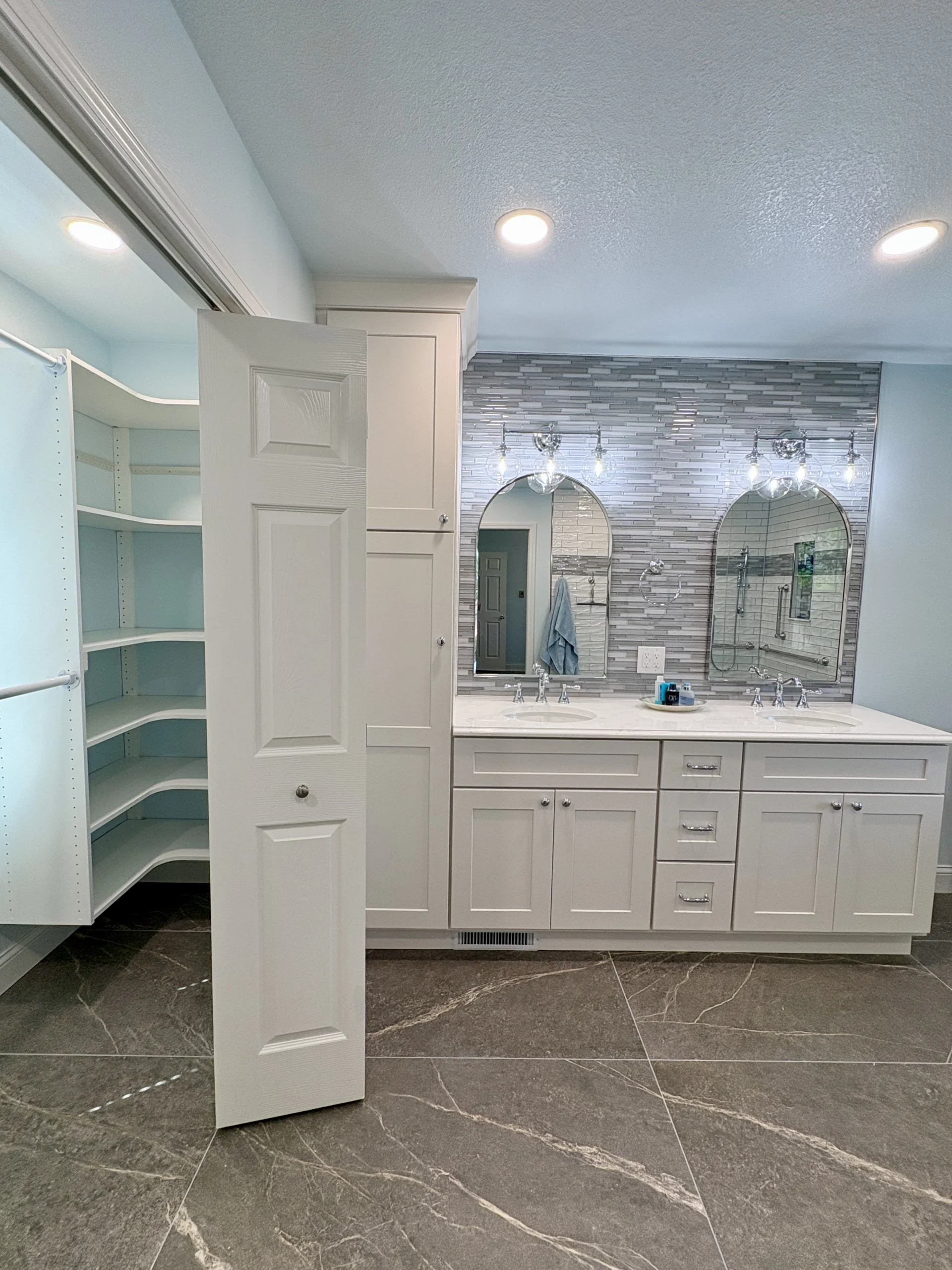 Inside, we designed a thoughtful and accessible layout featuring a custom zero-entry tile shower, secure grab bars, a handheld + rain shower system, and a glass wall for openness and maneuverability. The dual vanity provides both beauty and functionality, while upgraded lighting and large-format flooring improve visibility and accessibility throughout the space.