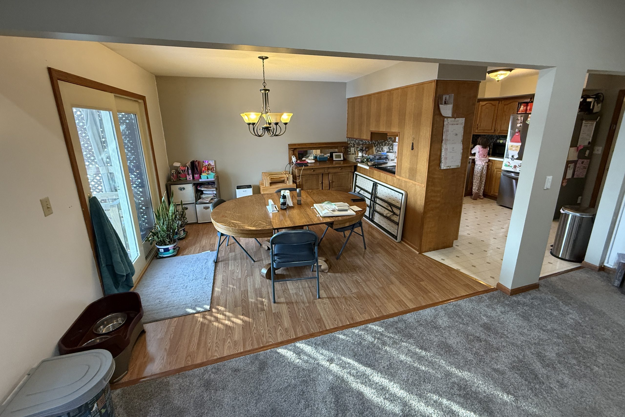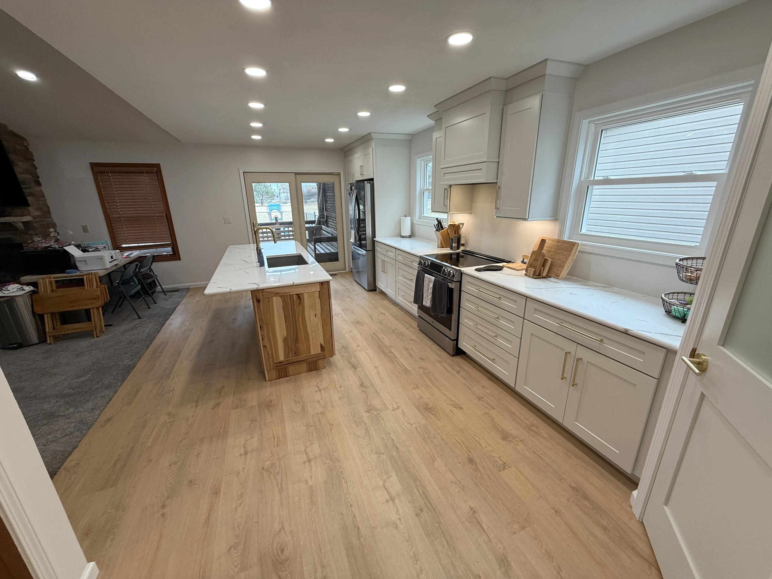 – Removed posts, headers, and soffits to fully open the kitchen and dining layout.