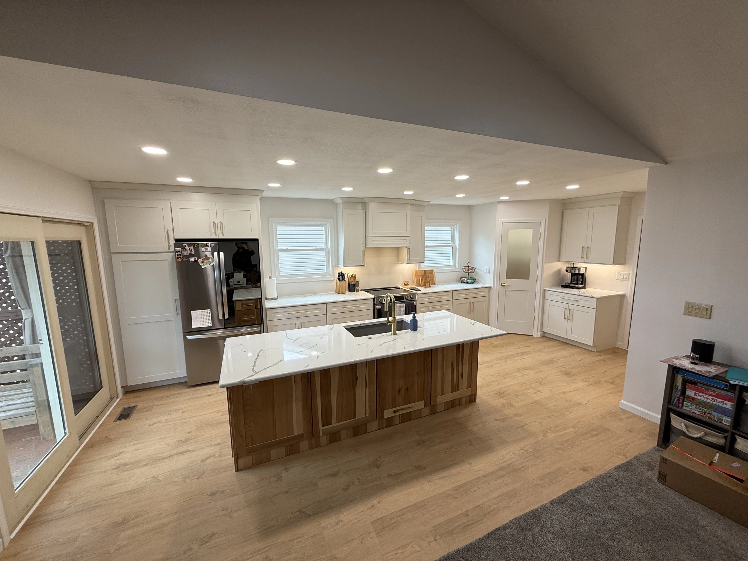 What started as a dark, enclosed kitchen with low soffits, heavy posts, and divided rooms has now become a bright, open, beautifully connected space. Our team removed structural barriers—including posts, headers, and soffits—to completely reimagine the footprint and create a true open-concept layout.