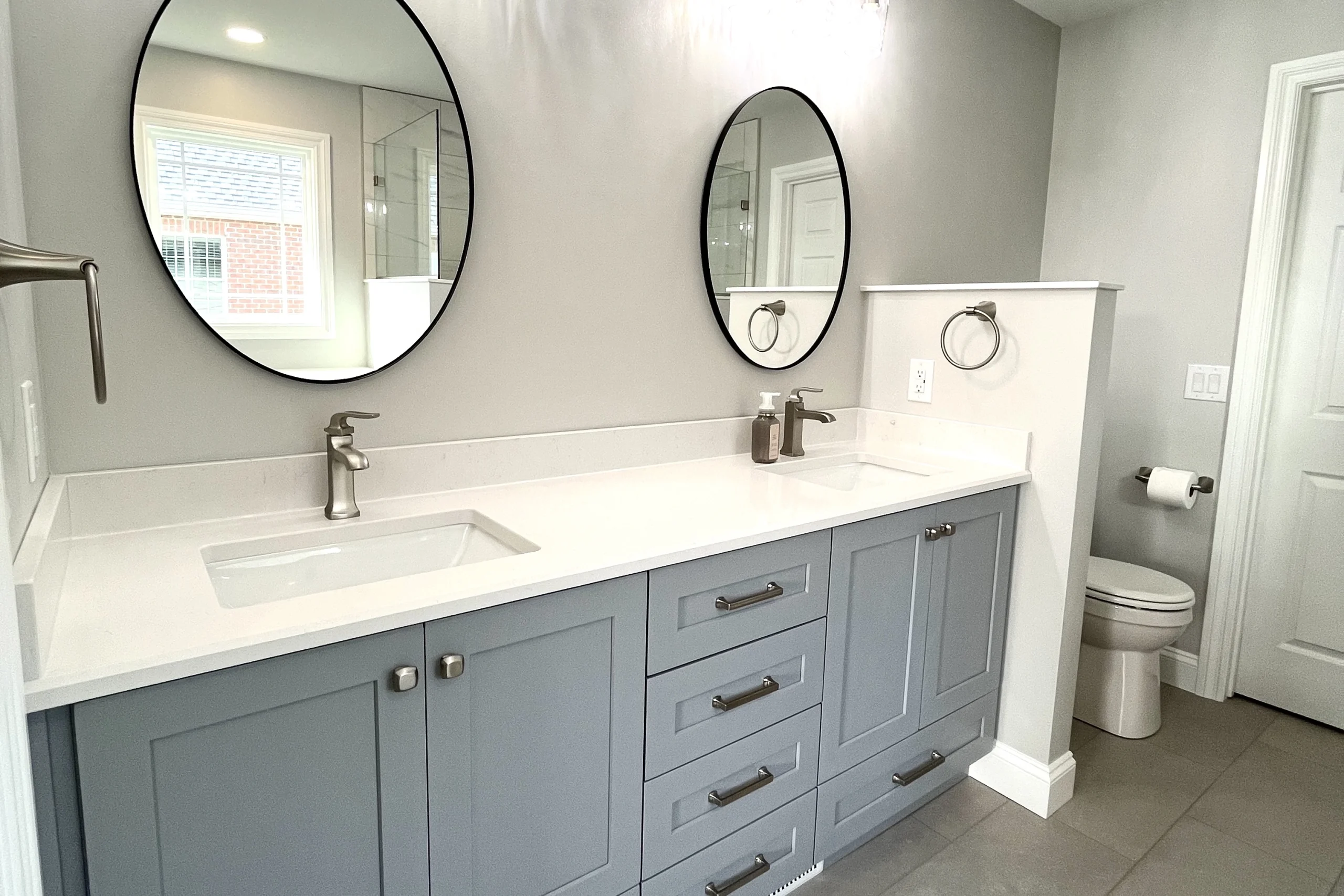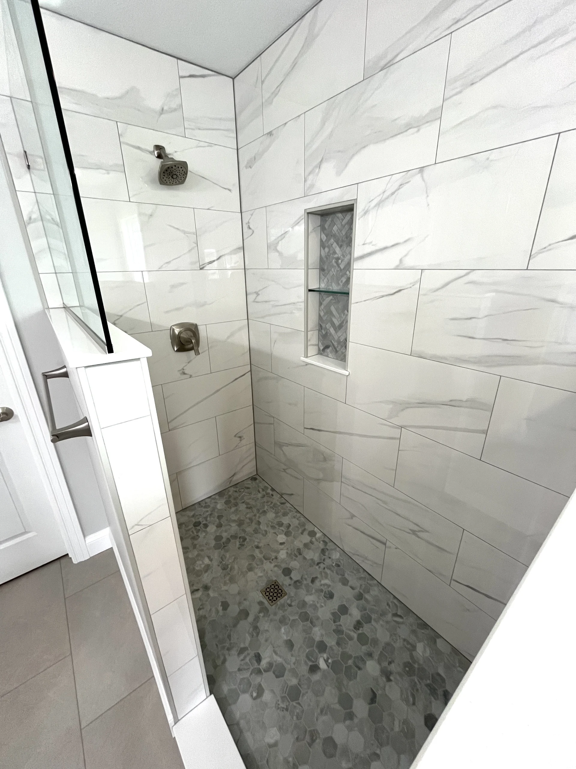 To accommodate the homeowners’ desire for a more spacious shower, we installed a new, larger window and built a custom-tiled shower complete with a half wall, glass panels, and a thoughtful niche for storage. The updated lighting, fresh finishes, and soothing color palette bring the entire space together, creating a bathroom that feels clean, calm, and beautifully updated.