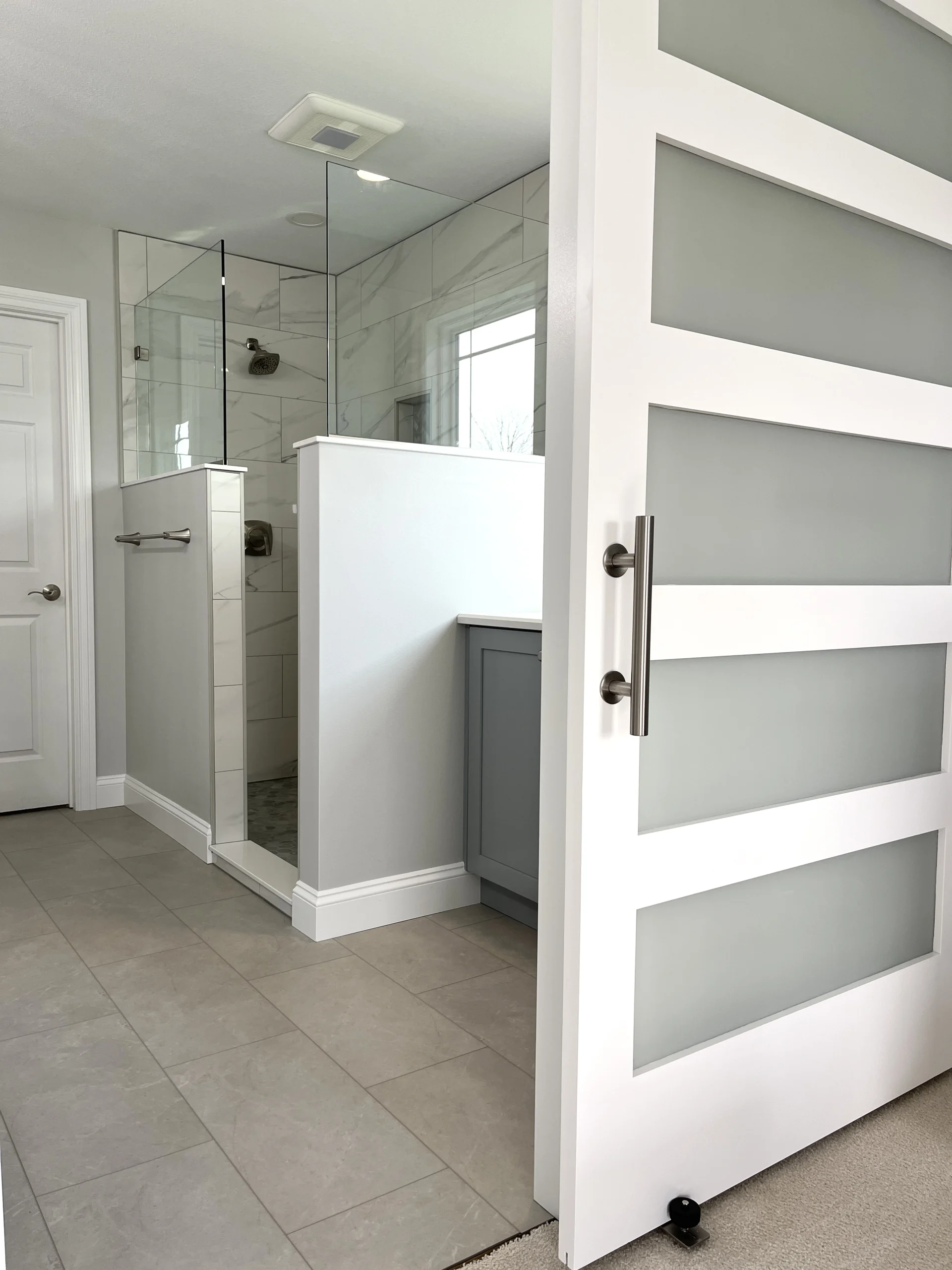– Added a frosted glass barn door for privacy with a clean, modern touch.