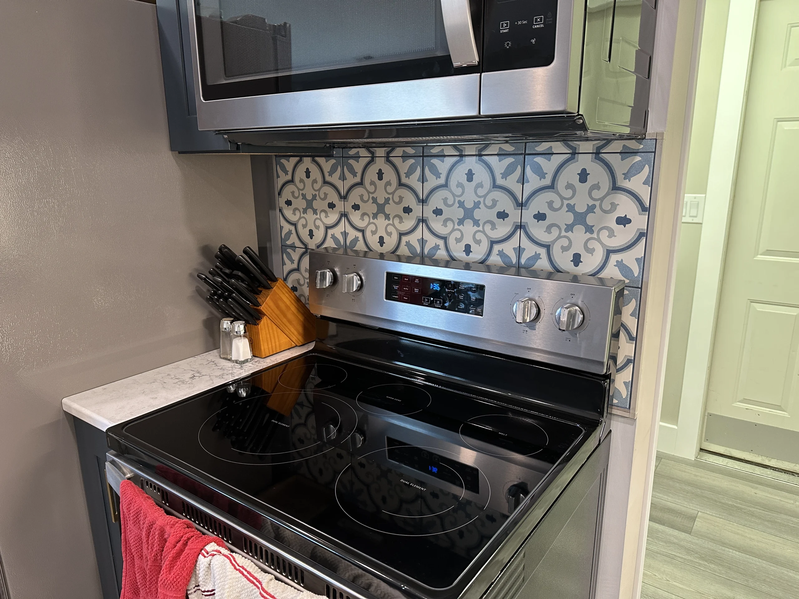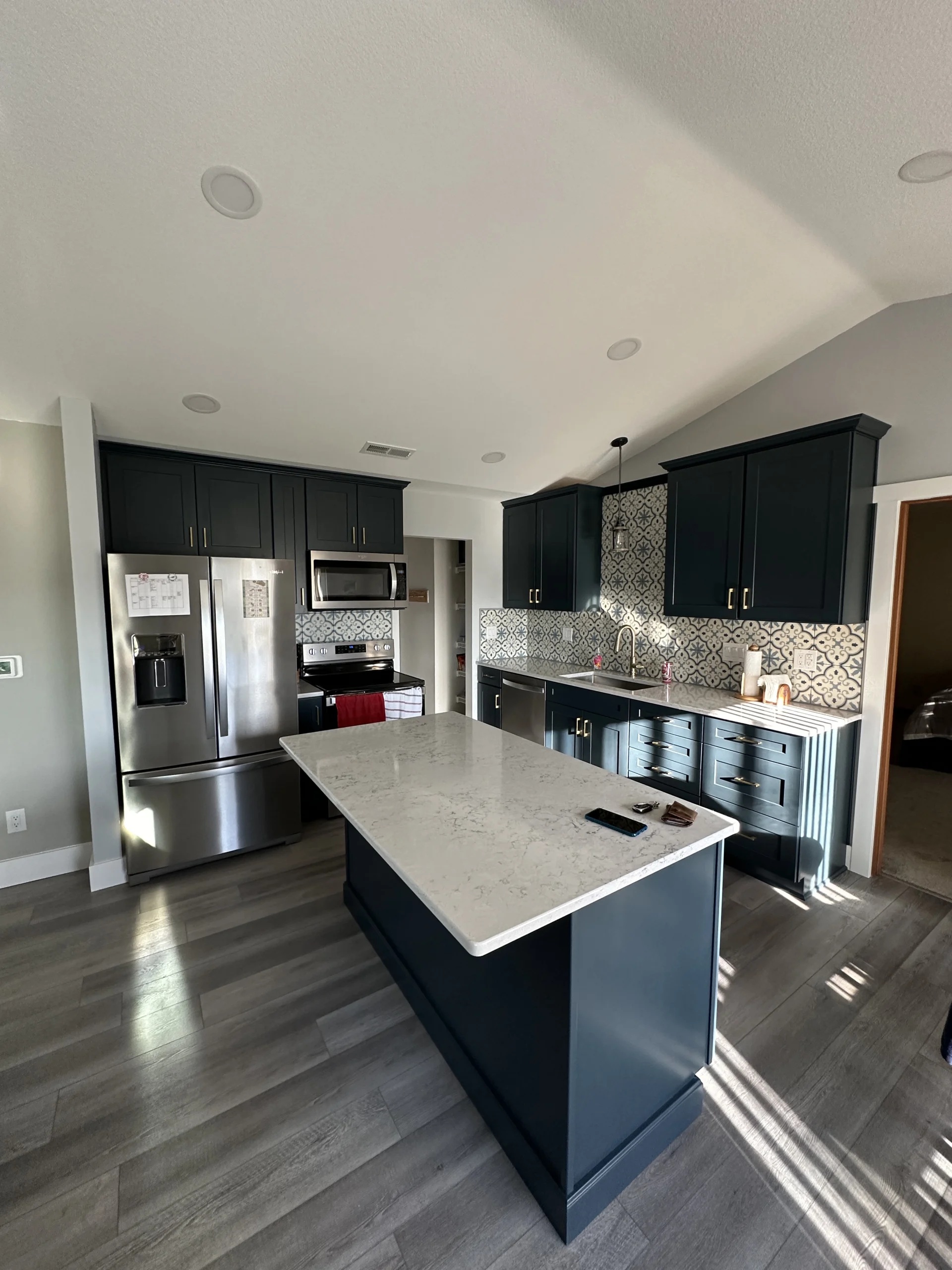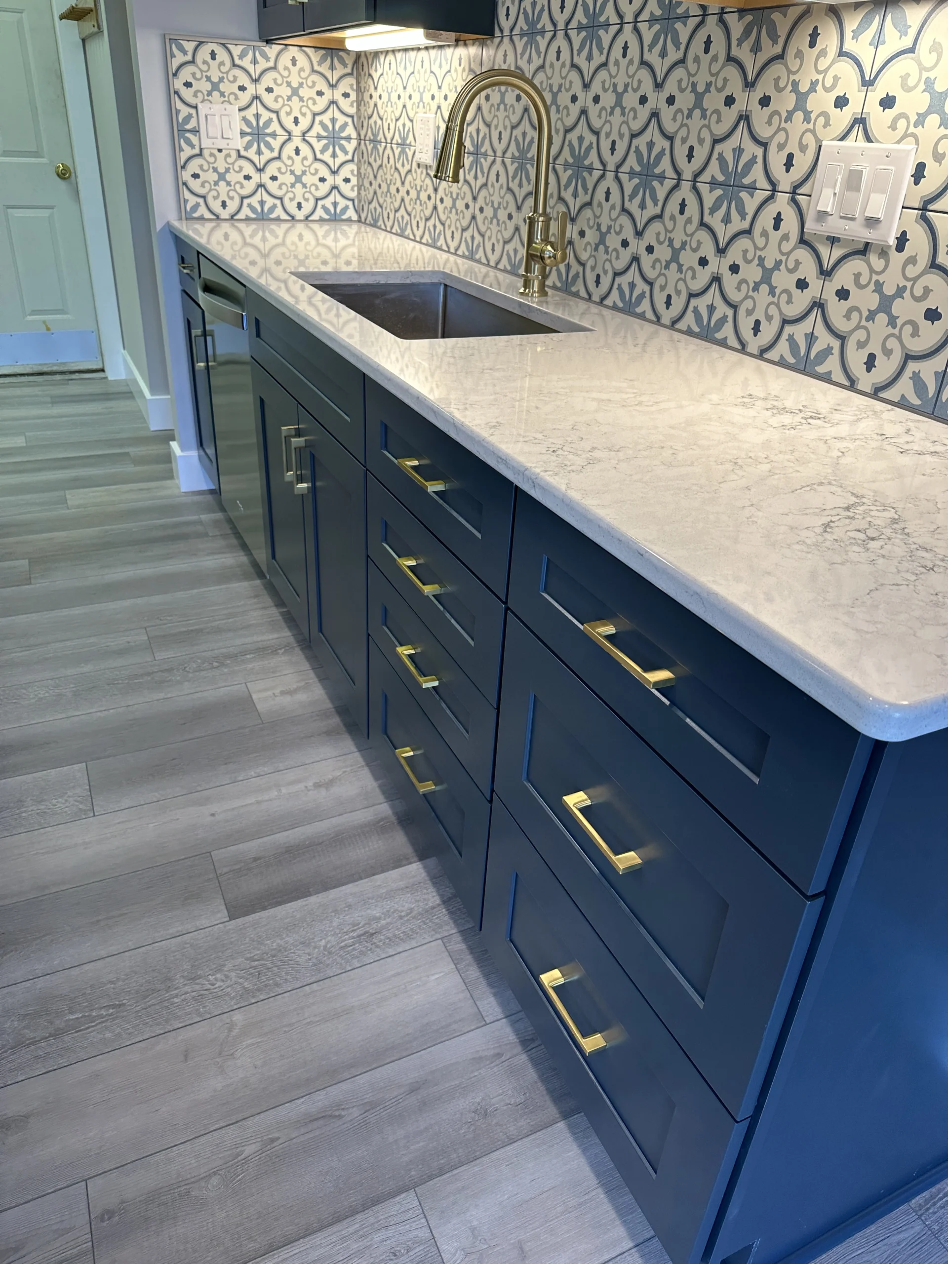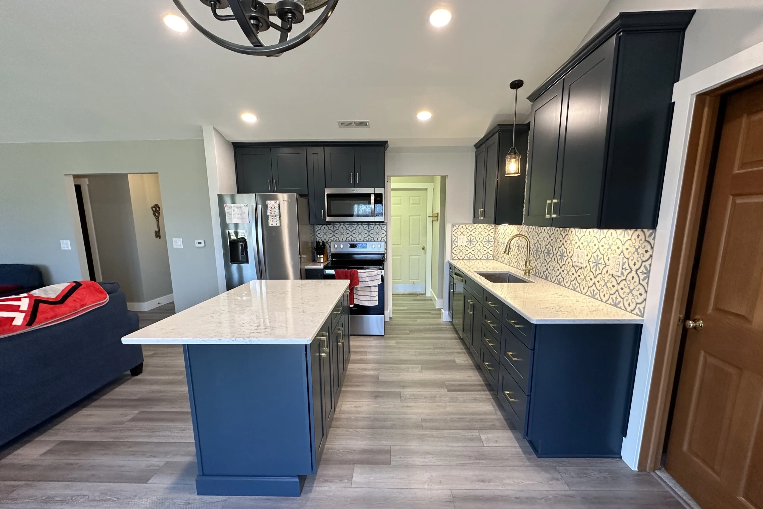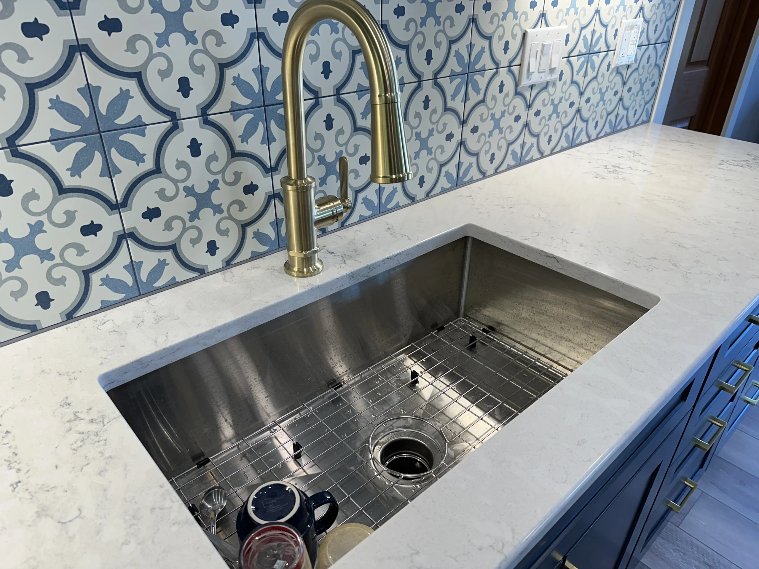 The kitchen is now a stunning focal point. New cabinetry, quartz surfaces, and thoughtful layout changes bring both beauty and functionality. One of our favorite design moments is the statement backsplash, highlighted with the homeowner’s choice of ‘Starry Night’ blue grout – a custom detail that brings personality and charm to the space.