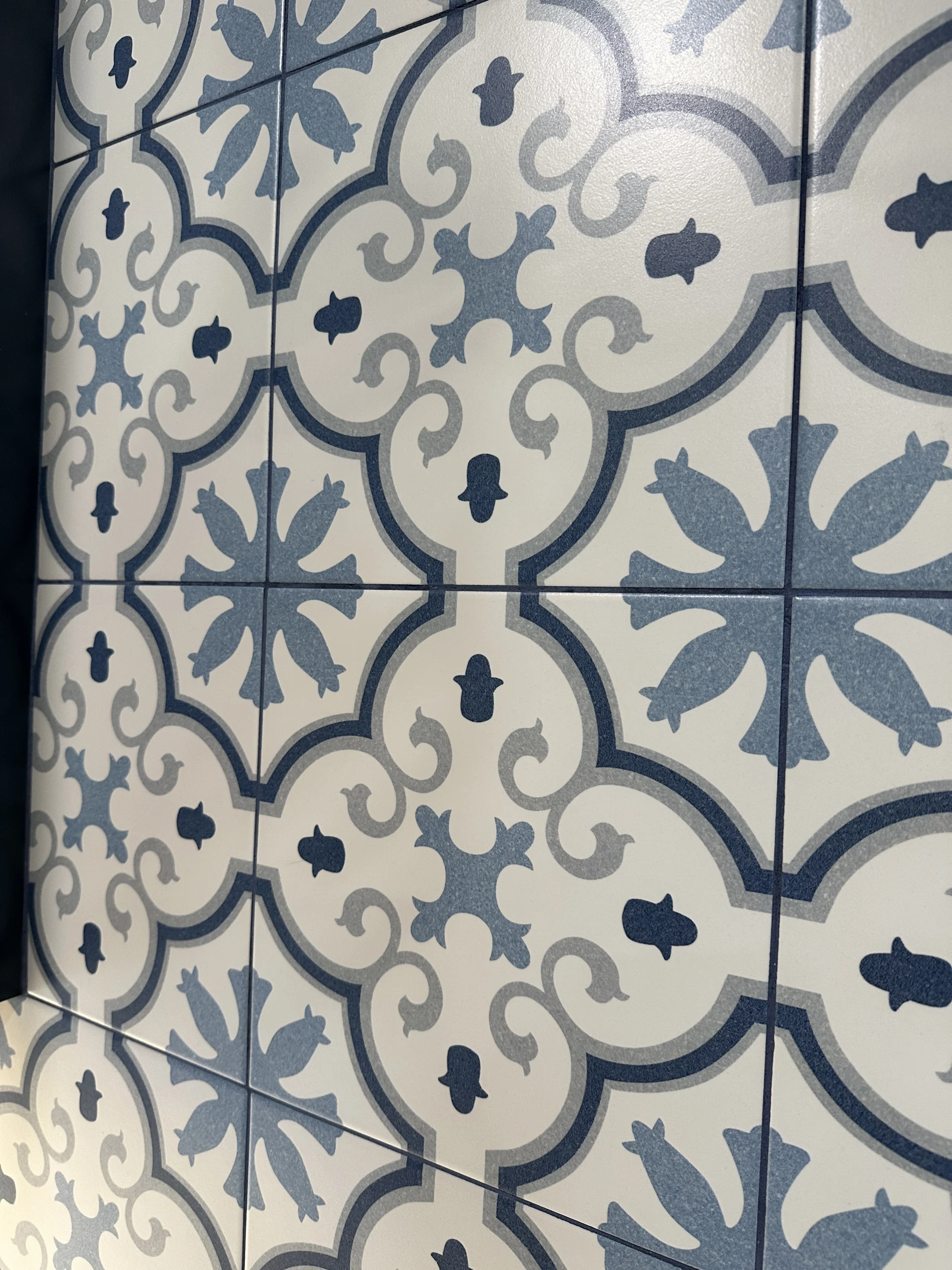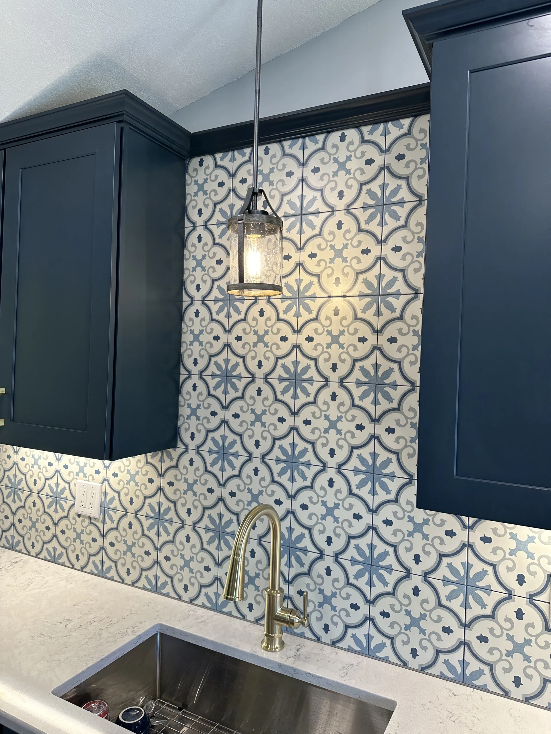– Statement backsplash paired with ‘Starry Night’ blue grout for a bold, custom detail.