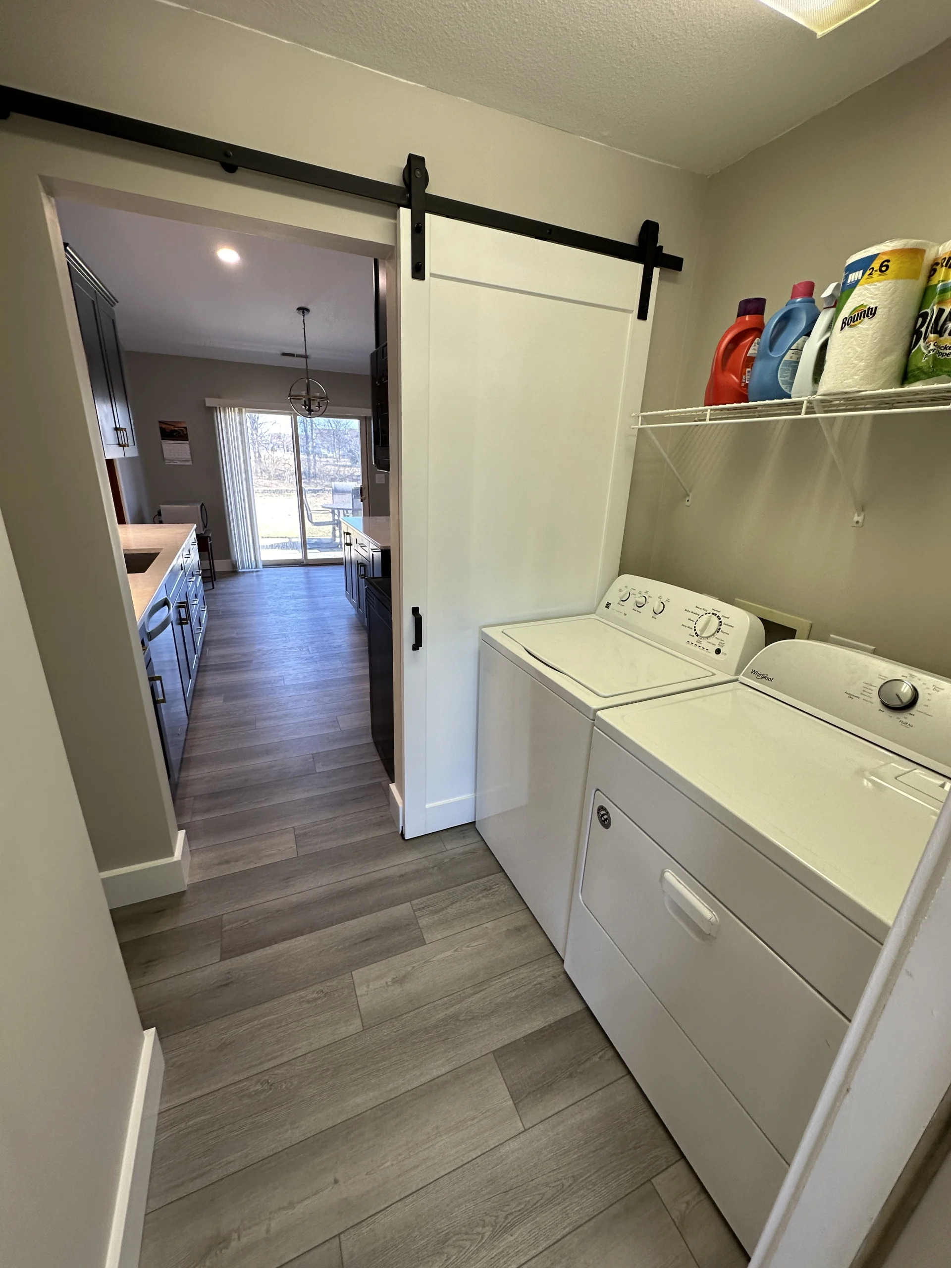 Throughout the main floor, we installed COREtec luxury vinyl plank flooring, added fresh paint, and finished the home with clean craftsman-style trim for a cohesive and airy feel. The previous hinged laundry-room door created a tight pinch point, so we replaced it with a smooth-sliding barn door that tucks neatly out of the way.