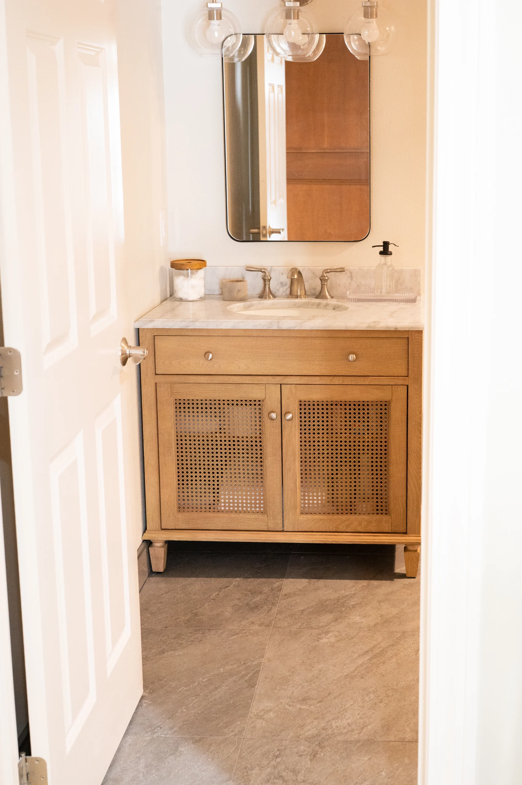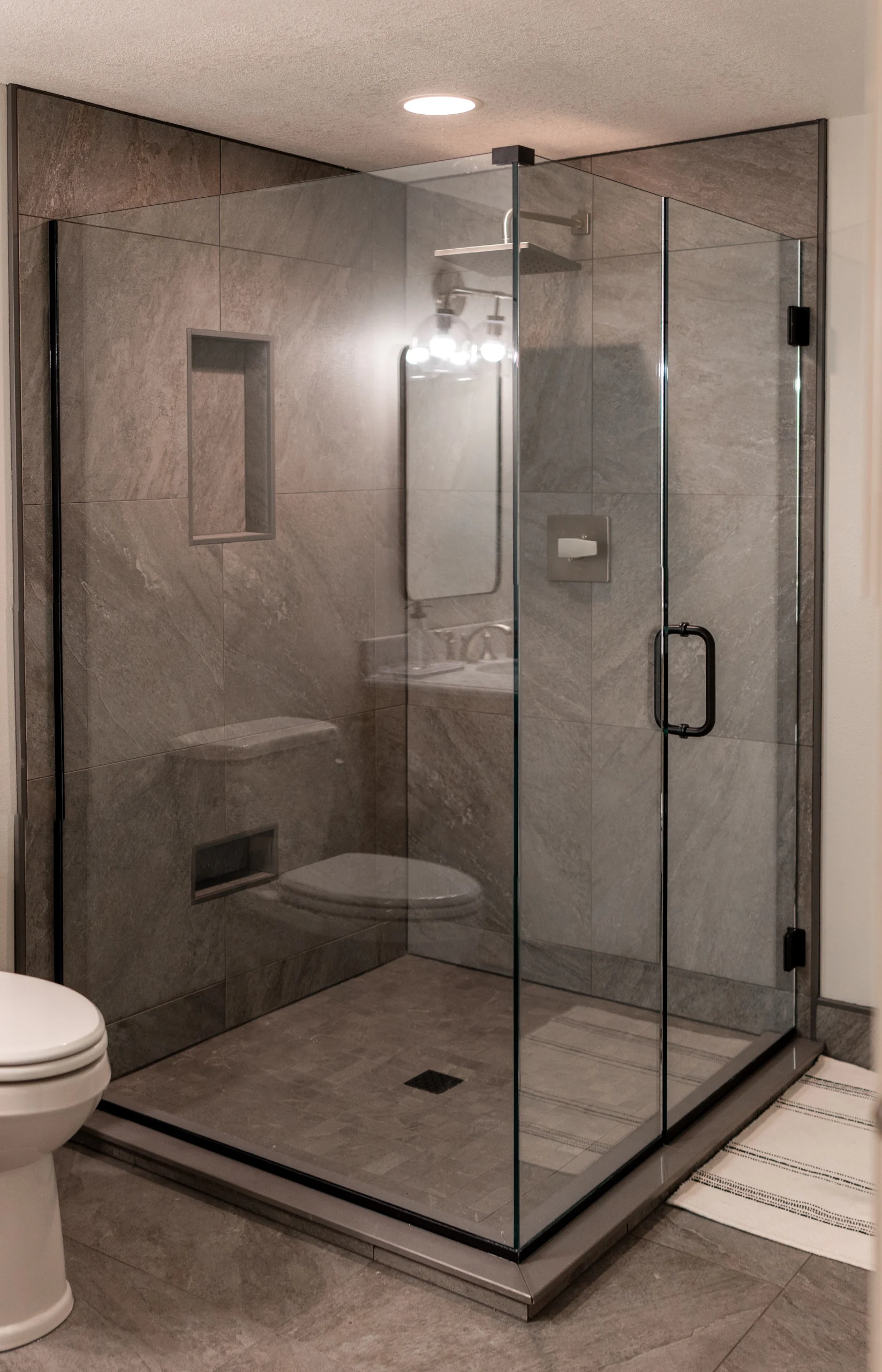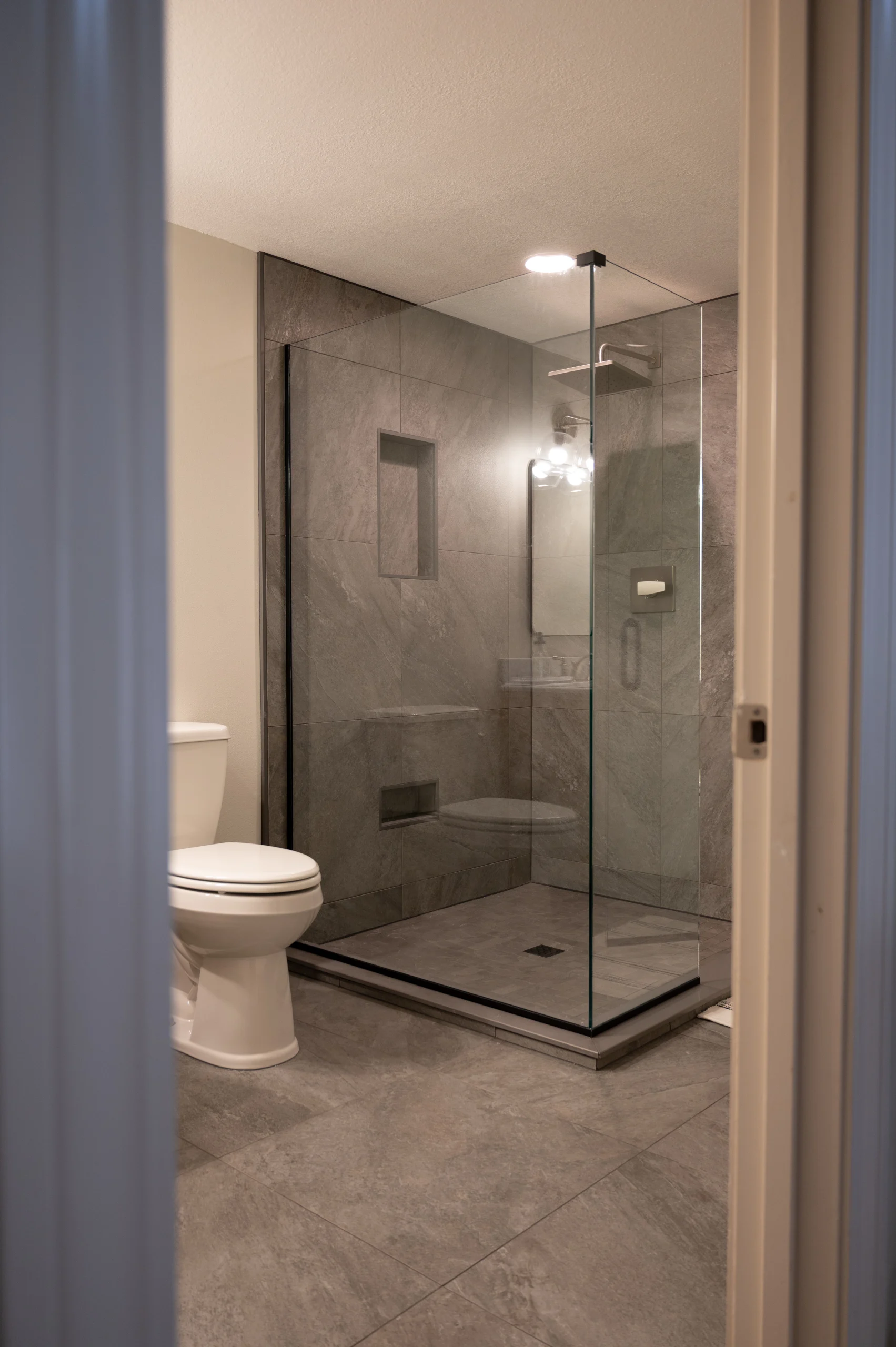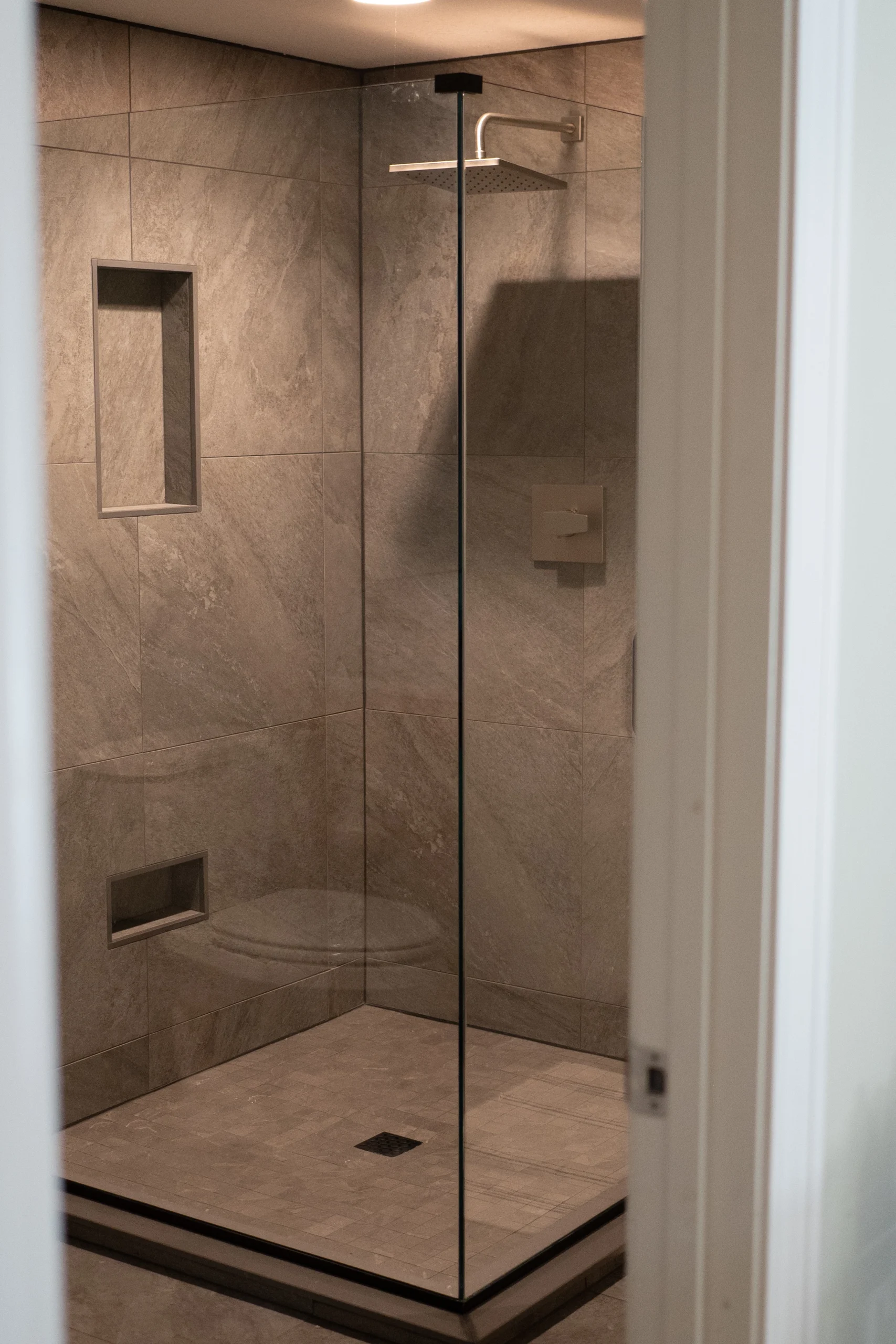 – 24×24 large-format porcelain tile throughout the space for a modern, seamless look.