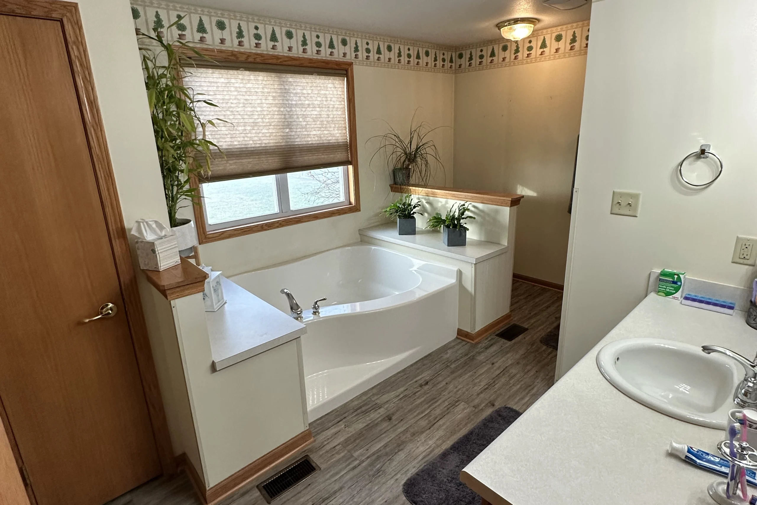 – Pebble-stone flooring around the tub and in the shower for added texture and comfort.