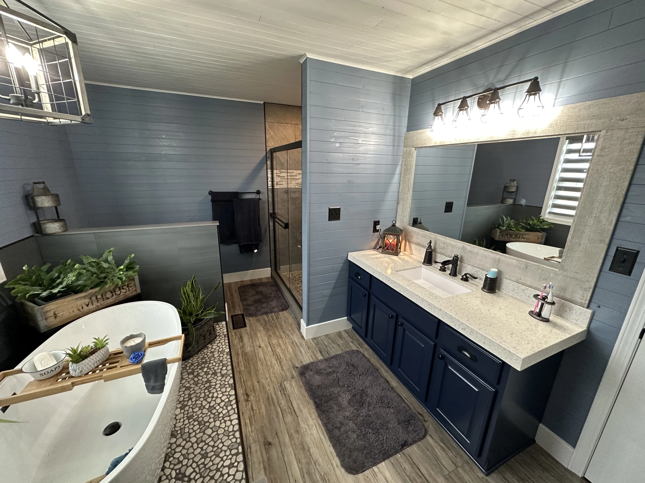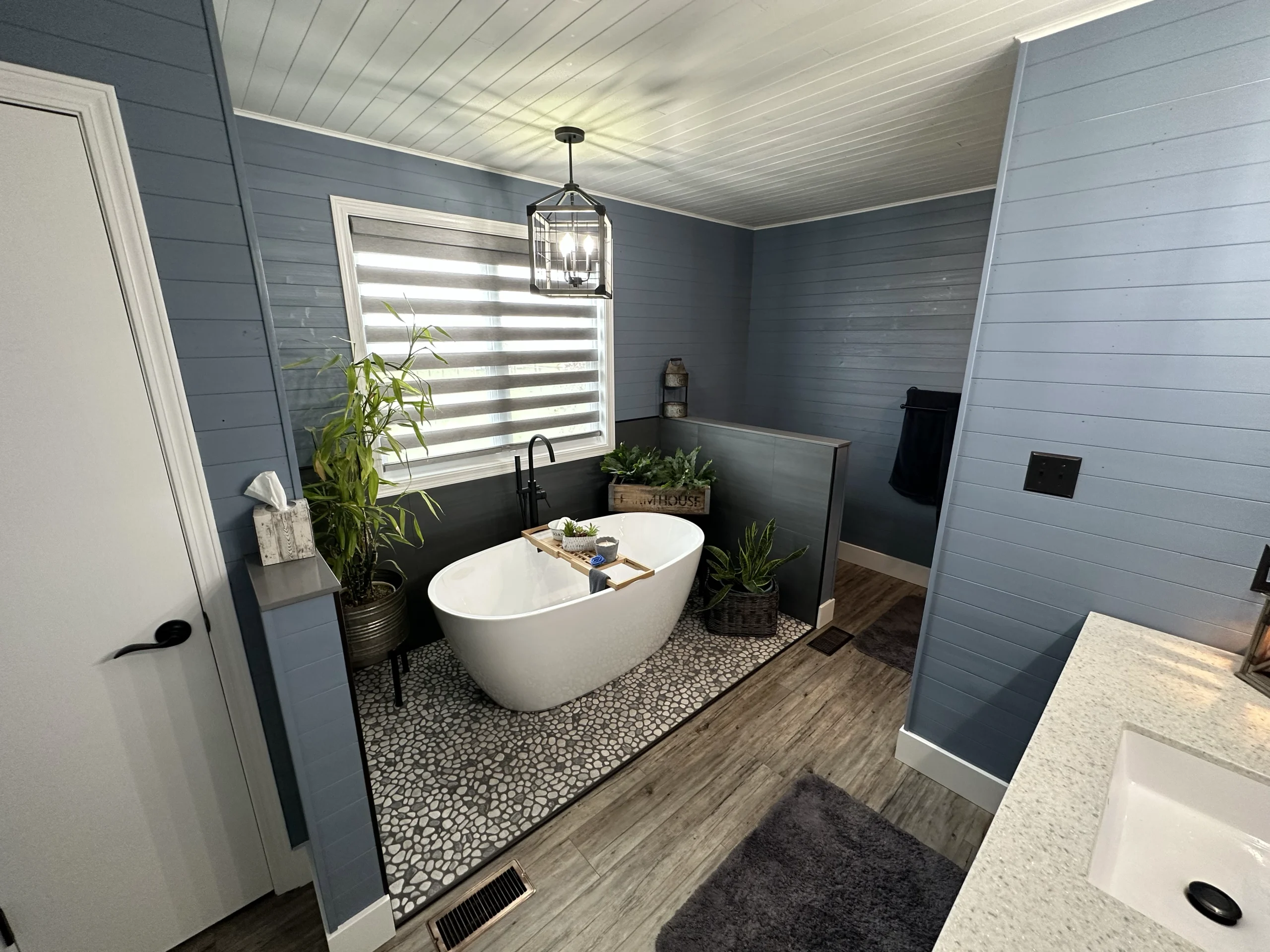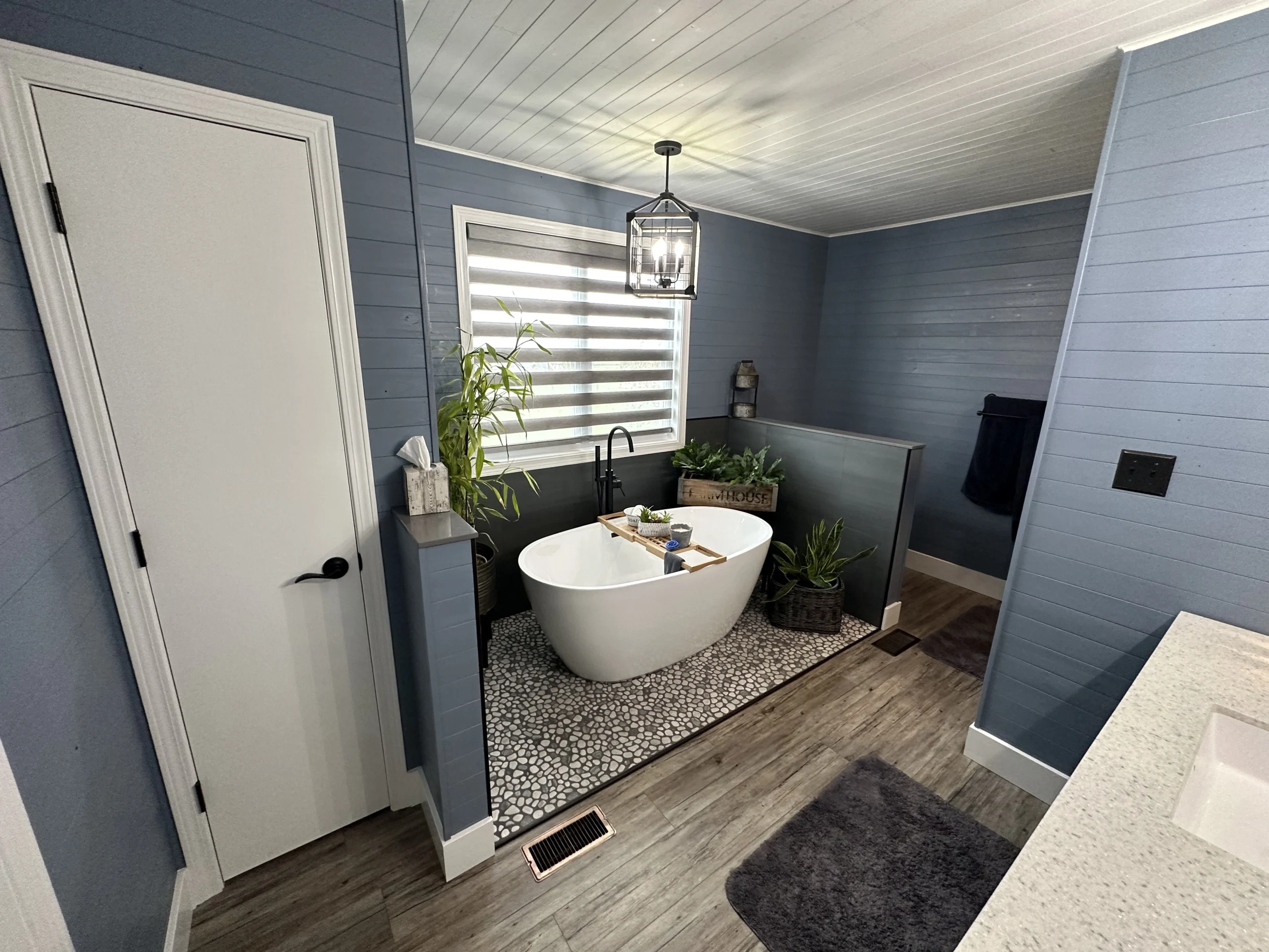 New lighting, updated fixtures, and thoughtful accessories finish the space with warmth and refinement. The final result is a bathroom that feels both rustic and refreshing — the perfect blend for a relaxing everyday oasis.