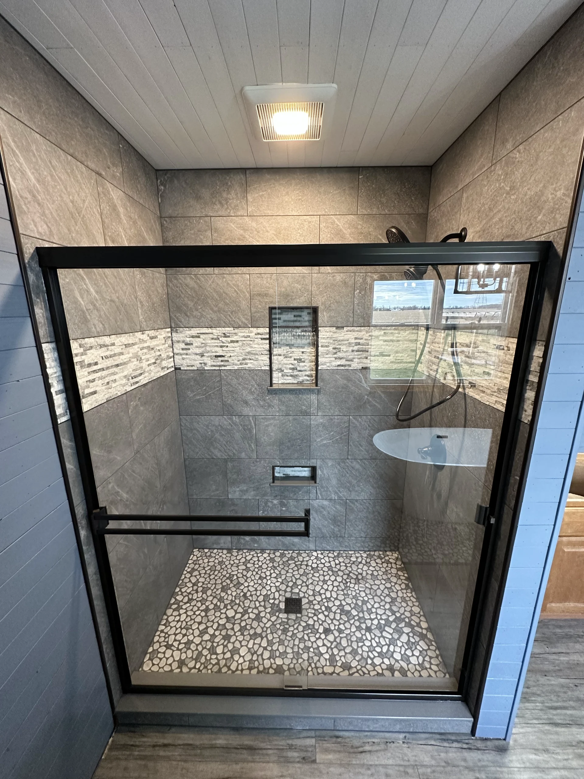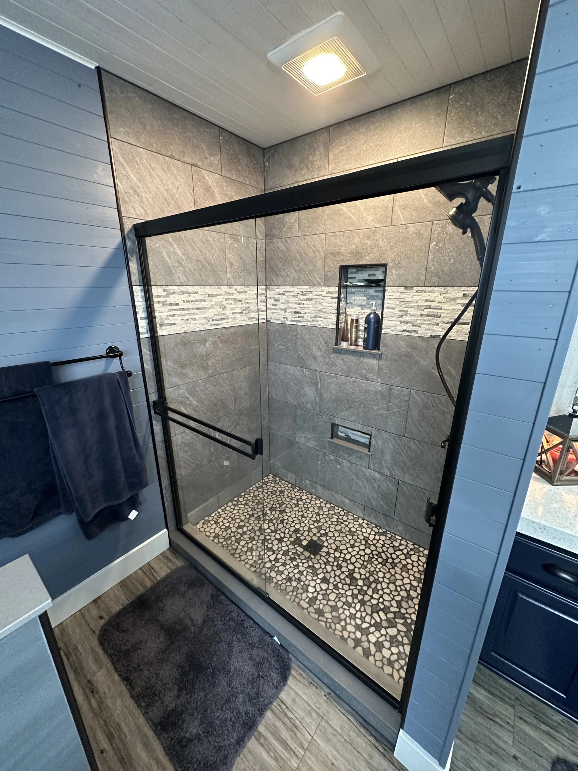 The centerpiece of the remodel is the walk-in shower, built with rich gray tile, a functional shaving niche, and a striking accent band that adds visual depth. Paired with a pebble-stone shower floor, the space feels grounded, natural, and refreshingly unique.