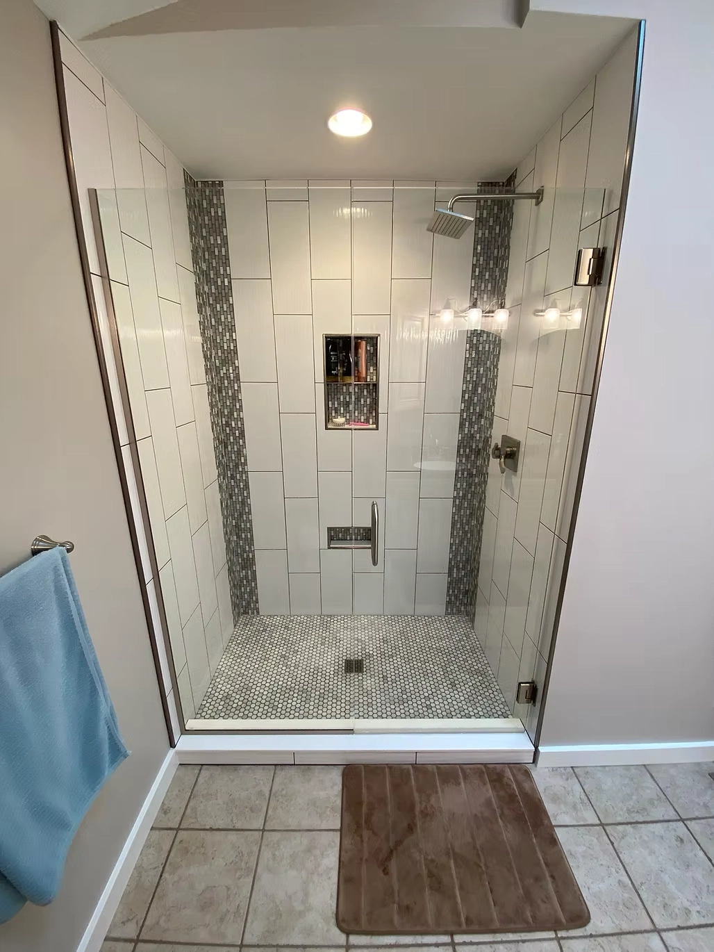 – Custom shower glass enclosure by Midwest Glass Fabricators and Kleeberger Contracting Services installers.