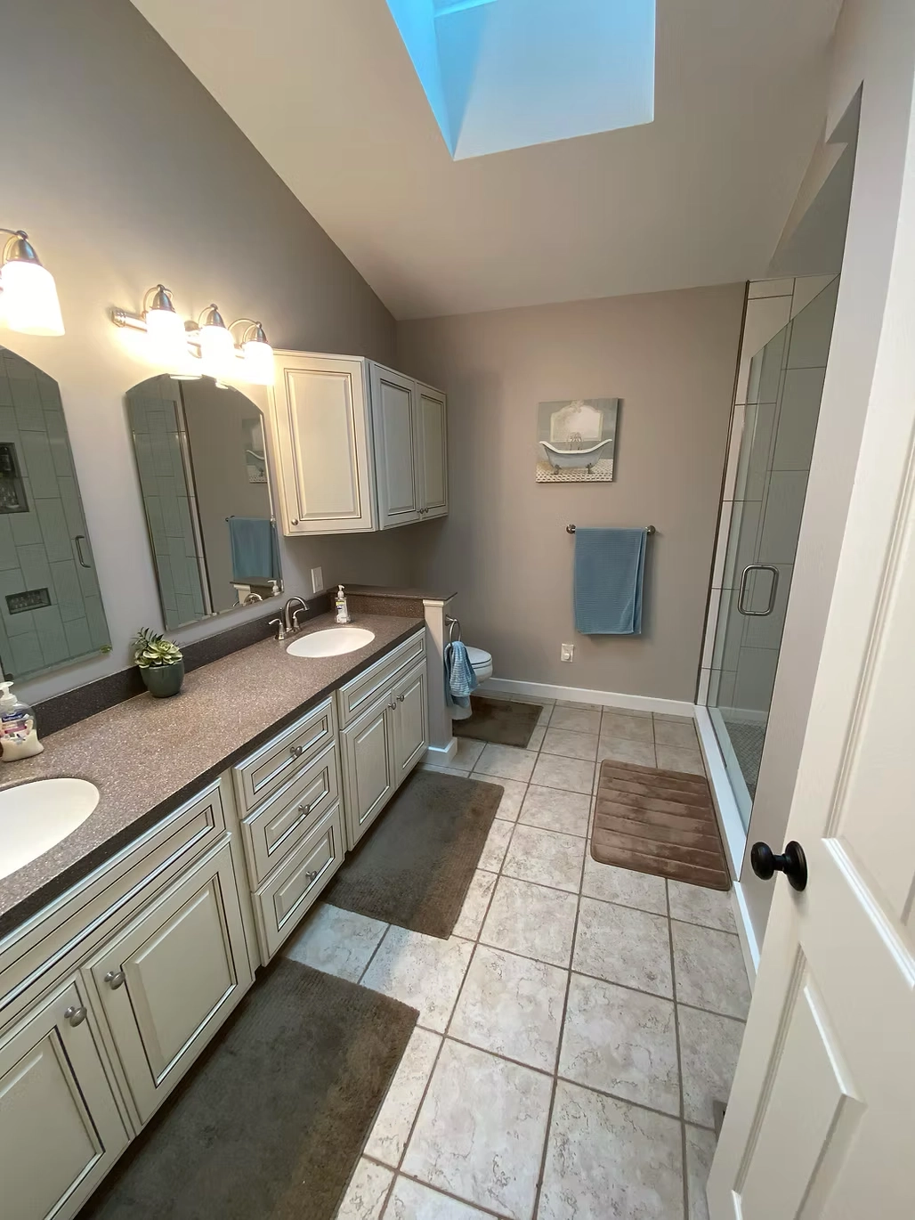 – Custom tiled shower with vertical accent tile on shower corners and back of shower wall niche.